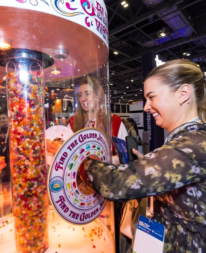 Visitors interact with the installation and collect treats, creating a playful moment within the exhibition stand environment.