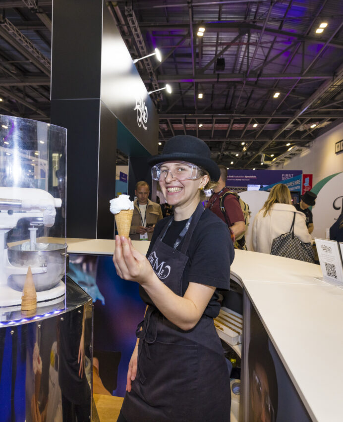 The preparation process produces dramatic clouds of vapour, turning the experience into a visual performance that attracts attention from across the exhibition hall. Visitors enjoy freshly prepared ice cream while watching the theatrical production process unfold.