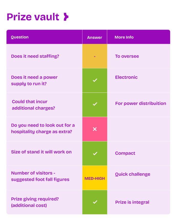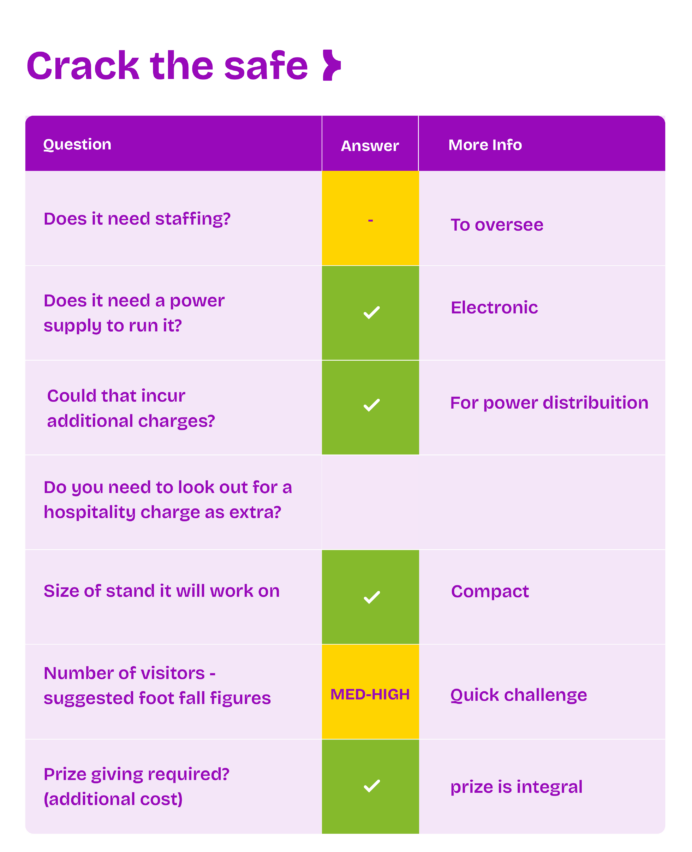 Crack the Safe is an activation where participants answer questions to unlock a code and win a prize.